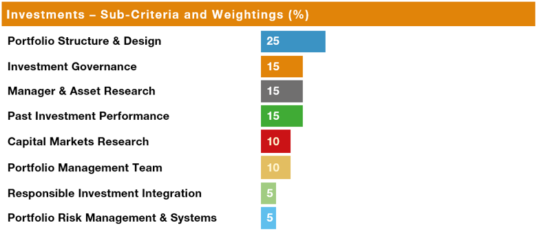 Investments are obviously important and account for 45% of our overall rating for pension members. When we rate a fund's investments, we do not focus on past returns. Rather, we focus on assessing the quality of the fund's investment governance, its in-house investment team, its external asset consultant (particularly for research), and the structure of its investment portfolios. If it does these things well, it is likely to have strong, long-term performance.