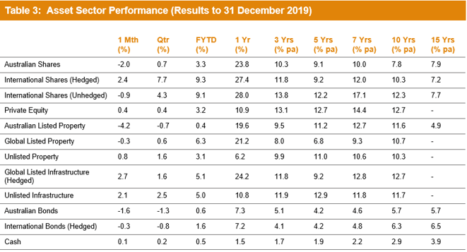 "Shares remain the main contributors to growth fund performance with about a 53% allocation on average. But today's funds are well-diversified across a range of other assets as well, and in 2019 all asset sectors delivered positive returns. The better performing funds were generally those that maintained higher allocations to listed shares, which had a terrific year. International shares surged 27.4% in hedged terms and 28% unhedged while Australian shares gained 23.8%. Funds would also have benefited greatly from having money invested in listed real assets with global listed infrastructure, global listed property and Australian listed property returning 24.2%, 21.2% and 19.6%, respectively. Those that kept more of their traditional defensive exposure in bonds rather than cash would also have helped their performance."