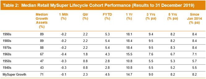 "It's difficult to make direct comparisons of the performance of these age-based options with the traditional options that are based on a single risk category, and for that reason we report them separately. Table 2 shows the median performance for each of the retail age cohorts, together with their current median allocation to growth assets."