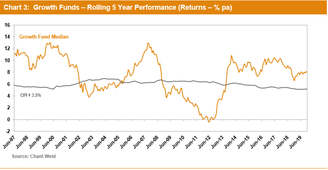 "The strong long-term performance is borne out visually in Chart 3, which compares the growth category median with the average return objective of CPI plus 3.5% per annum over rolling five year periods – that's after investment fees and tax. Until 2009, the median fund outperformed the target most of the time. The GFC brought that to an abrupt halt, and the median dipped below the target line for several years. Now, with the GFC period out of the calculation, the five year return has been tracking well above the target line for about six-and-a-half years."
