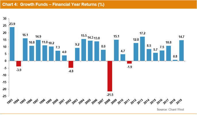 "The 2019 result brings the average return over the past 10 years to 7.9% per annum. That's a tremendous run, but we should remember that it partly represents the recovery from the GFC when the median growth fund fell about 26%. We also need to keep in mind that growth funds aren’t designed to yield such returns over the long term – typically they're built to return 3.5% above inflation per annum which translates to 5.5% to 6% per annum over the long term, or rather less than that in today's low inflation environment. So it would be a mistake to assume that the level of returns over the past decade will continue. At some stage they’re going to revert to more ‘normal’ levels, and there will be more challenging times ahead.