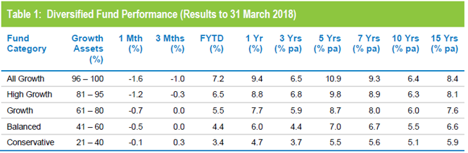 Recent months have seen volatility return to global share markets, sparked by investor concerns over the prospect of rising inflation, rising interest rates and the potential consequences of US-China trade sanctions. Hedged international shares were down 2.2% over the quarter, but a lower Australian dollar (which fell against all major currencies) meant that there was actually a small gain of 0.8% in unhedged terms. On average, growth funds currently have about 70% of their international shares exposure unhedged so they benefited greatly from currency movements over the quarter.