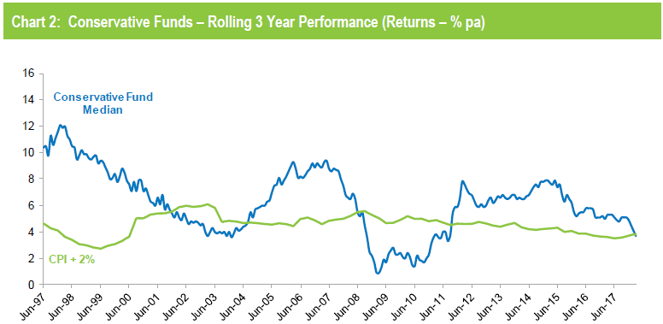 Chart 2 compares the performance of the lower risk Conservative category (21 to 40% growth assets) median with its typical objective of CPI plus 2% per annum over rolling three year periods. It shows that, after exceeding that objective for most of the post-GFC period, they have now fallen fractionally behind. This is because traditional bonds and cash, which form a significant part of their portfolios, have delivered relatively low returns in recent years.
