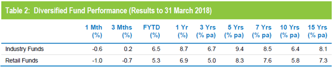 Industry funds outperformed retail funds over the March quarter, returning 0.2% versus -0.7%, and remain ahead over the financial year to date, at 6.5% versus 5.3%. Industry funds also continue to hold the advantage over the medium and longer term, ahead by between 0.6% and 1.8% per annum, as shown in Table 2.