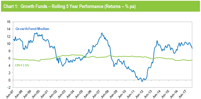 Chart 1 compares the performance since July 1992 – the start of compulsory superannuation – of the Growth category median with the typical return objective for that category (CPI plus 3.5% per annum after investment fees and tax over rolling five year periods). The healthy returns in recent years, and with the GFC period now out of the calculation, have seen the five year performance tracking well above that CPI plus 3.5% target.