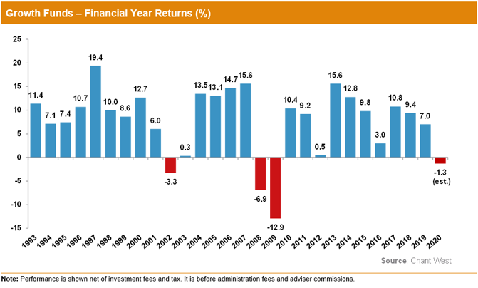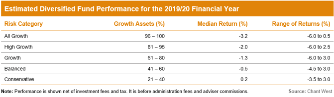 Barring an extraordinary final day, super funds are set to post a small negative return for the 2019/20 financial year – the first in 11 years. With one business day remaining, Chant West’s early estimate is that the median growth fund (61 to 80% in growth assets) will return -1.3%. While a negative result is never welcome, containing the loss to such a small number must be considered a good outcome considering the chaos the world has been thrown into by COVID-19.