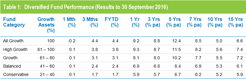 After a tumultuous finish to 2015/16, super funds have got off to a good start in the new financial year. Over the September quarter, the median growth fund (61 to 80% allocation to growth assets) gained a solid 3.1%.