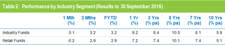 Industry funds outperformed retail funds over the quarter, returning 3.2% versus 2.9%. Industry funds also continue to hold the advantage over the longer term, having returned 5.8% per annum against 5.1% for retail funds over the ten years to September 2016, as shown in Table 2.