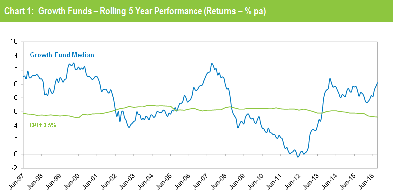 Chart 1 compares the performance since July 1992 – the start of compulsory superannuation – of the Growth category median with the typical return objective for that category (CPI plus 3.5% per annum after investment fees and tax over rolling five year periods). The healthy returns in recent years, combined with the GFC period having worked its way out of the calculation, have seen the five year return continue to track well above that CPI plus 3.5% target.