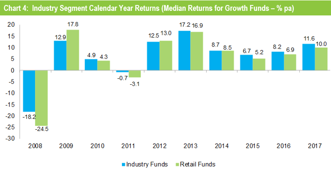 Chant says: "Over the longer term industry funds, as a group, have outperformed retail funds largely because of the way they have allocated their investments and their preparedness to vary those allocations to suit changing market conditions.