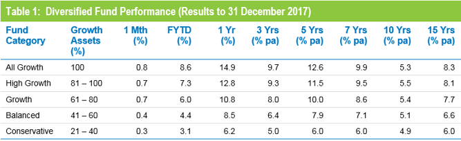 "Shares are still the main drivers of performance, but the major funds are well diversified across a wide range of other sectors including unlisted assets. The better performing funds in 2017 were those that had higher allocations to listed shares and to unlisted assets generally. A lower exposure to traditional bonds and cash also helped, given their mediocre returns."
