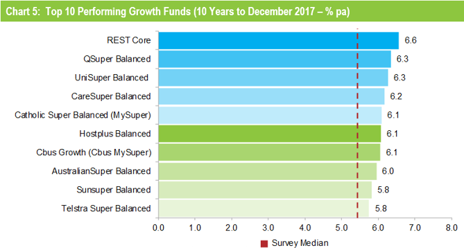 Chart 5 shows the top 10 performing funds over ten years. As has been the case for many years, the list is dominated by industry funds which account for eight of the ten places. The other two places are occupied by QSuper, a non-profit fund formerly reserved for Queensland Government employees that has recently opened its doors to the public, and the stand-alone fund for employees of Telstra.