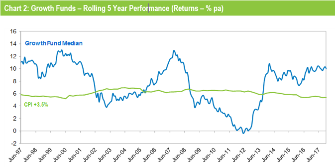 "That's borne out visually in Chart 2, which compares the growth category median with the average return objective of CPI plus 3.5% per annum after investment fees and tax over rolling five year periods. Until 2009, the median fund outperformed the target most of the time. The GFC brought that to an abrupt halt, and the median dipped below the target line for several years. Now, with the GFC period out of the calculation, the five year return has been tracking well above the target line for the past four-and-half years."