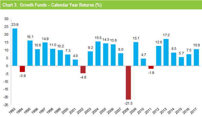 Chant West founder, Warren Chant says: "Growth funds have now delivered six straight positive calendar year returns, averaging over 10% a year. The last time we saw such a long sequence of positive returns was between 1995 and 2001. The 2017 return of 10.8% is the best result since 2013 when funds surged 17.2%. It is also more than 5% ahead of the typical long-term return objective for that category which is CPI + 3.5%. With inflation running at about 2%, that translates to a target of about 5.5%.