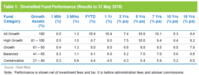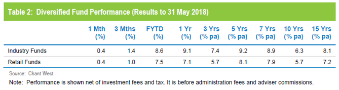 Industry funds and retail funds performed in line with each other in May, returning 0.4% but industry funds remain well ahead over the financial year to date, at 8.6% versus 7.5%. Industry funds also continue to hold the advantage over the medium and longer term, ahead by between 0.6% and 1.7% per annum, as shown in Table 2.