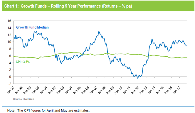 Chart 1 compares the performance since July 1992 – the start of compulsory superannuation – of the Growth category median with the typical return objective for that category (CPI plus 3.5% per annum after investment fees and tax over rolling five year periods). The healthy returns in recent years, and with the GFC period now out of the calculation, have seen the five year performance tracking well above that CPI plus 3.5% target.