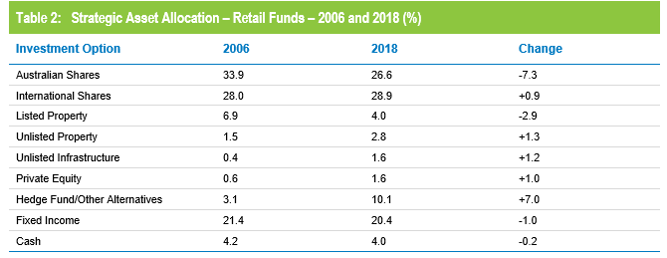 The reduced allocations to Australian shares. Funds have traditionally had a significant home bias in their equities exposure, partly due to the favourable tax treatment of franked dividends from Australian companies. More recently, they have recognised the limitations of the Australian market because of its concentration on financials and resources, and the much larger opportunity set that exists internationally. Funds on average now have higher allocations to international shares than they do to the local market, and it could be argued that further moves in that direction may be warranted.