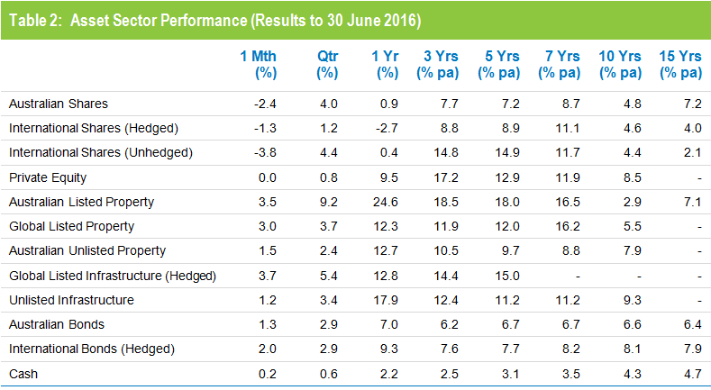 - Australian listed property was the best performing asset sector with a very strong return of 24.6%. Unlisted Australian and global listed property also produced healthy returns of 12.7% and 12.3%, respectively.