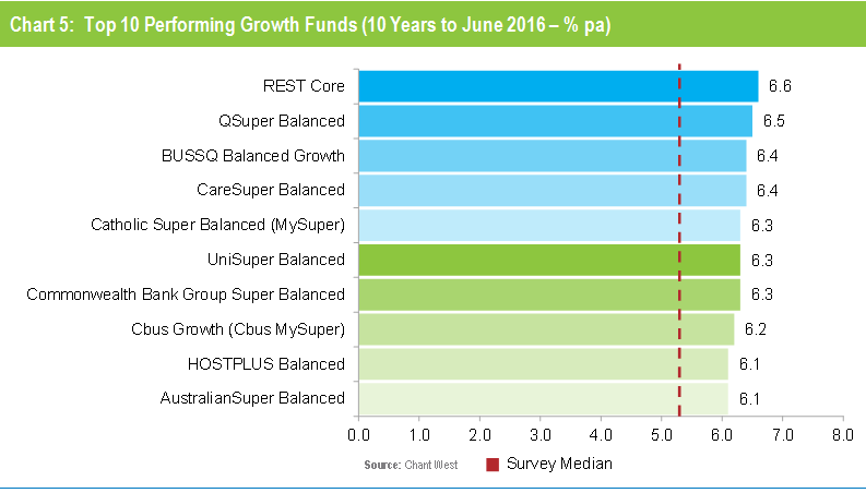 Chart 5 shows the top 10 performing funds over ten years. As has been the case for many years, the list is dominated by industry funds which account for eight of the ten places. The other two places are occupied by QSuper, which is a non-profit fund primarily for Queensland public servants, and the stand-alone fund for employees of Commonwealth Bank.
