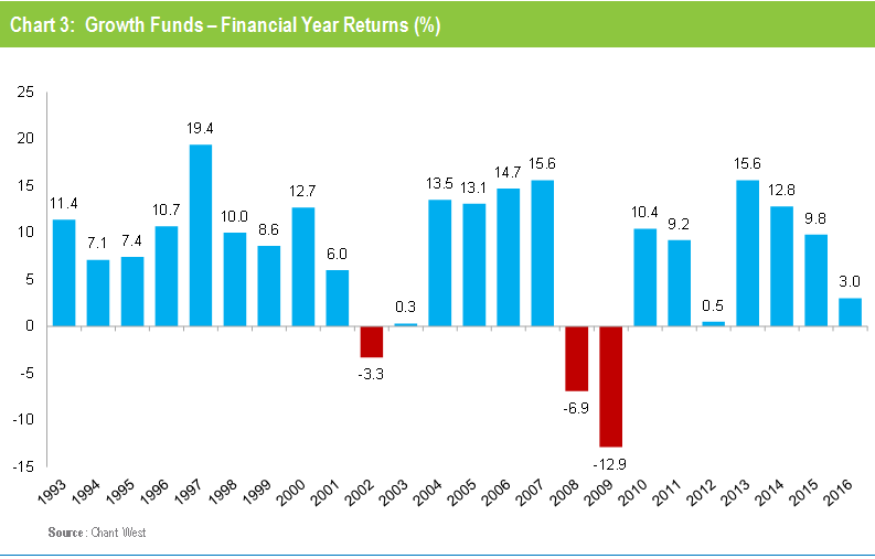 "In addition to their return objectives, most funds also set themselves a risk objective. Typically, for a growth fund, this is to post a negative return no more often than once in every five years on average. Chart 3 plots the year by year performance of the median growth fund over the full 24 financial years since the introduction of compulsory super. In that time, there have been three years when returns were negative. That averages out to one year in eight, so the risk objective has also been met.
