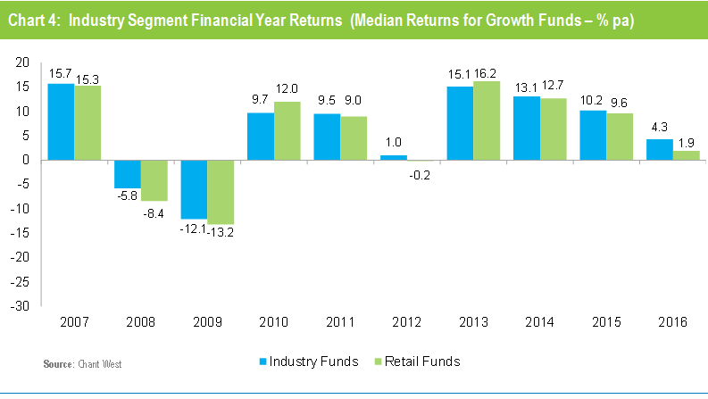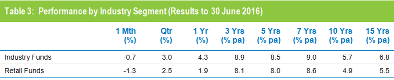 Industry funds outperformed retail funds over the year, returning 4.3% versus 1.9%. Industry funds also hold the advantage over the longer term, having returned 6.8% per annum against 5.5% for retail funds over the 15 years to June 2016, as shown in Table 3.