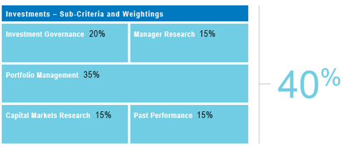 Investments now carries a weighting of 40% in our overall fund assessment, up from 35%. When we assess a fund’s investments we look at the quality of its investment governance, its capital market and manager research, its internal and external resources and – most importantly – its portfolio structure and portfolio management capabilities and processes. Those factors are reflected in our ratings criteria, as shown in the Chart below.