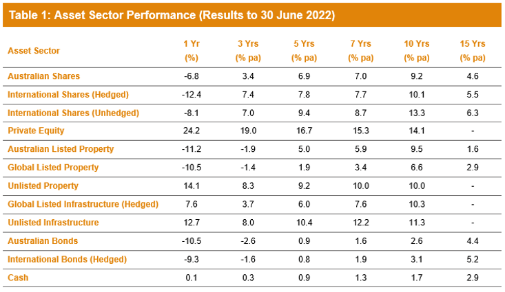 And now the 2022 financial year has provided yet another test, and it’s fair to say that funds have passed it with flying colours. A negative annual return is never easy to digest, but a loss of just 3.3% must be considered a success when every listed market in the traditional asset sectors (other than cash) fell significantly. Indeed, the only meaningful positive return among all the public market sectors we measure came from global infrastructure.