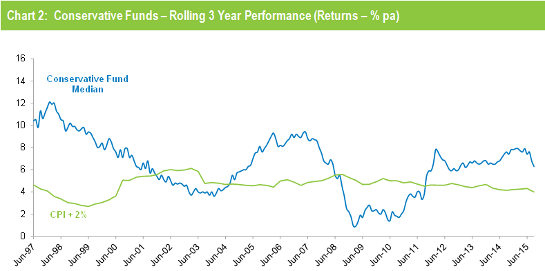 Chart 2 compares the performance of the lower risk Conservative category (21 to 40% growth assets) median with its typical objective of CPI plus 2% per annum over rolling three year periods. It shows that Conservative funds have also exceeded their objective in recent times.