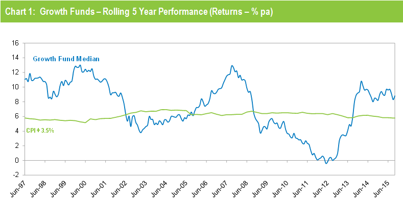 Chart 1 compares the performance since July 1992 – the start of compulsory superannuation – of the Growth category median with the typical return objective for that category (CPI plus 3.5% per annum after investment fees and tax over rolling five year periods). The healthy returns in recent years, combined with the GFC period having worked its way out of the calculation, have seen the five year return rise sharply. For about two years it has been tracking well above that CPI plus 3.5% target.