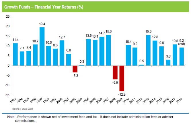 Chant West senior investment research manager, Mano Mohankumar, says: “Growth funds will post another strong return for the 2018 financial year and extend their streak of positive years to nine, with some funds delivering double digit results. That’s a fantastic result, especially given that investment managers have been saying for some time that all asset classes are close to or fully valued and that it’s becoming increasingly difficult to find additional sources of return.