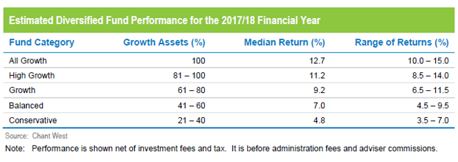 The table below shows the estimated median performance and ranges for each category in Chant West’s Multi-Manager Survey, ranging from All Growth to Conservative.
