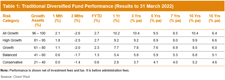 Chant West Senior Investment Research Manager, Mano Mohankumar, says the positive outcome in March came despite the serious concerns that continue to weigh on investment markets – notably the Russia-Ukraine war and the threat of rising inflation and interest rates. “The geopolitical and economic implications of the war are still a major unknown. So far, it has resulted in an energy and commodity price shock that has amplified the surge in inflation. So central banks around the world are faced with a dilemma; either increase the pace of interest rate hikes to combat inflation or hold back on the tightening in an effort to support economic growth. So far, it appears they view inflation as the more pressing issue and in March we saw the US Federal Reserve increase its target rate by 0.25%, with further increases expected through 2022. That pattern is likely to continue in the US and elsewhere unless the outlook for economic growth worsens significantly.