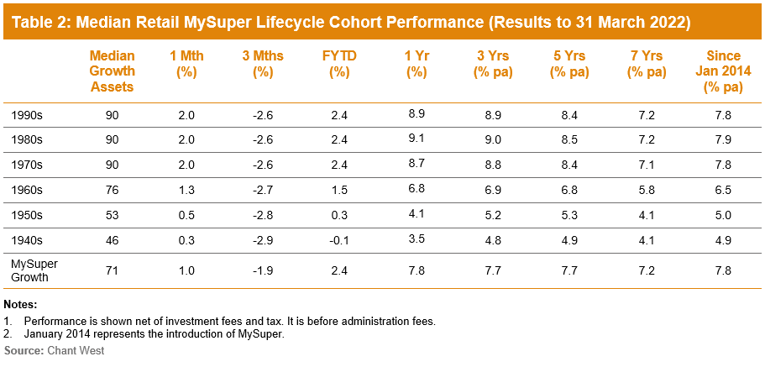 “It’s difficult to make direct comparisons of the performance of these age-based options with the traditional options that are based on a single risk category, and for that reason we report them separately. Table 2 shows the median performance for each of the retail age cohorts, together with their current median allocation to growth assets. For comparison purposes it also includes a row for traditional MySuper Growth options – nearly all of which are not-for-profit funds. Care should be taken when comparing the performance of the retail lifecycle cohorts with the median MySuper Growth option, however, as they’re managed differently so their level of risk varies over time.”