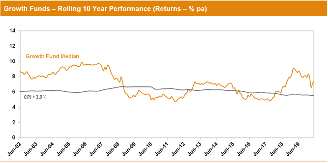 For most of the compulsory super era, funds typically set their return objectives over rolling five-year periods. However, over recent years we’ve seen more and more funds move to re-set their objectives over rolling ten-year periods, which is more consistent with a longer-term focus. We believe it is appropriate for us now to use rolling ten-year performance data when we plot the performance of the median fund versus the typical return objective. The chart below shows that, for the majority of the time, the median growth fund has exceeded its return objective. The exceptions are two periods between mid-2008 and mid-2017, when it fell behind. This is because of the devastating impact of the 16-month GFC period (end-October 2007 to end-February 2009) during which growth funds lost about 26% on average. That impact persists far longer in a rolling 10-year chart than it does in our previous rolling 5-year chart.
