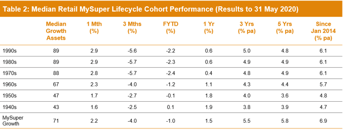 The reason these younger cohorts in retail lifecycle funds have underperformed the MySuper Growth option is that, while they are generally well-diversified, these funds don’t have the same level of diversification as many of the not-for-profit funds. This is mainly due to the not-for-profit funds’ higher allocations to unlisted assets (unlisted property, unlisted infrastructure and private equity) – about 21% on average. This compares with the retail lifecycle fund average of 5% for these younger cohorts, although there are a few that have 10-14% unlisted asset allocations. These assets have been proven to add value over the long term, not just for their diversification qualities but also because they generate an illiquidity premium in their returns relative to listed markets. However, any performance comparison at the end of May is further complicated by the fact that some funds have devalued their unlisted assets more aggressively than others.