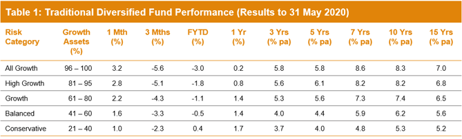 Super funds rose for the second consecutive month in May, with the median growth fund (61 to 80% in growth assets) up 2.2% as share markets continued to rally. With markets also up in June so far, we estimate that the financial year return is sitting at zero mid-way through the month so, remarkably, a positive year remains a real possibility. A final result that is flat or close to flat would be an excellent outcome considering the chaos the world has been thrown into by COVID-19.
