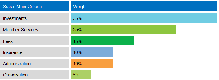 Funds are scored on each of these criteria, applying the weights shown in the table below to arrive at the overall scores. The two most important criteria – investments and member services – together account for 60% of a fund's overall rating.