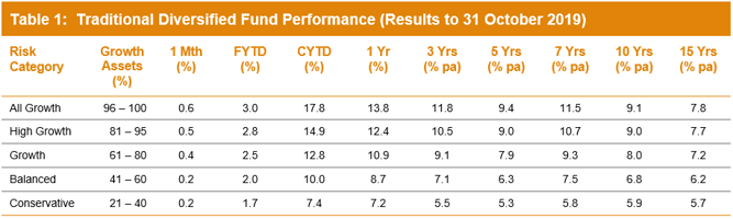 Super funds got a lift from positive global share markets in October, and now have a good chance of finishing the calendar year in double digit territory. The median growth fund (61 to 80% in growth assets) was up 0.4% for the month, pushing the return for the first ten months of 2019 to an impressive 12.8%. Midway through November, that figure has increased further to an estimated 14.3%.