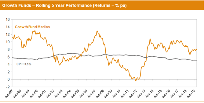 MySuper products have only been operating for less than six years, so when considering performance it is important to remember that super is a much longer-term proposition. The chart below compares the performance since July 1992 – the start of compulsory superannuation – of the traditional Growth category median with the typical return objective for that category (CPI plus 3.5% per annum after investment fees and tax over rolling five-year periods). The healthy returns since the end of the GFC in early 2009 have seen the longer-term performance tracking well above that CPI plus 3.5% target for the past six years.
