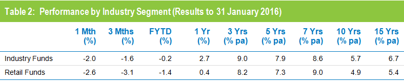 Industry funds outperformed retail funds in January with a return of -2% versus -2.6%. Industry funds also hold the advantage over the longer term, having returned 6.7% per annum against 5.4% for retail funds over the 15 years to January 2016, as shown in Table 2. Performance over three, five, seven and ten years is closer.