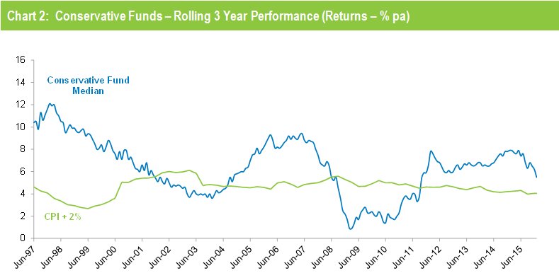 Chart 2 compares the performance of the lower risk Conservative category (21 to 40% growth assets) median with its typical objective of CPI plus 2% per annum over rolling three year periods. It shows that Conservative funds have also exceeded their objective in recent years.