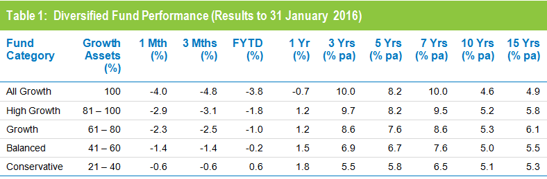 Super funds are off to a disappointing start in 2016 on the back of sharp falls in share markets worldwide. The median growth fund (61 to 80% allocation to growth assets) retreated 2.3% in January, and has continued to slide further into the red in February.