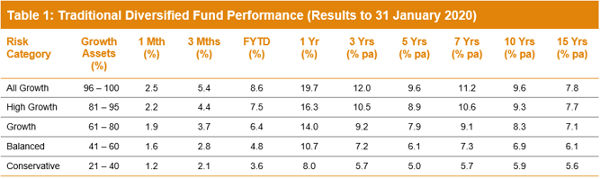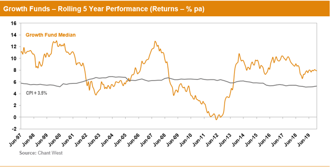 Table 1 compares the median performance for each of the traditional diversified risk categories in Chant West's Multi-Manager Survey, ranging from All Growth to Conservative.