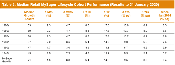 It's difficult to make direct comparisons of the performance of these age-based options with the traditional options that are based on a single risk category, and for that reason we report them separately. Table 2 shows the median performance for each of the retail age cohorts, together with their current median allocation to growth assets.