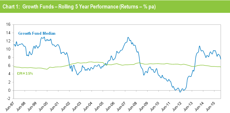 Chart 1 compares the performance since July 1992 – the start of compulsory superannuation – of the Growth category median with the typical return objective for that category (CPI plus 3.5% per annum after investment fees and tax over rolling five year periods). The healthy returns in recent years, combined with the GFC period having worked its way out of the calculation, have seen the five year return rise sharply. For about two years it has been tracking well above that CPI plus 3.5% target.