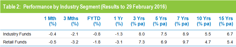 Industry funds and retail funds produced broadly similar results in February, with returns of -0.4% and -0.5% respectively. Industry funds still hold the advantage over the longer term, having returned 6.7% per annum against 5.4% for retail funds over the 15 years to February 2016, as shown in Table 2. Performance over three, five, seven and ten years is closer with retail funds actually ahead over seven years.