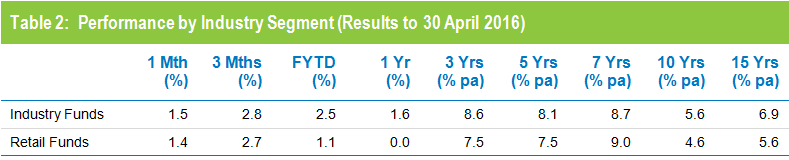 Industry funds and retail funds performed broadly in line with each other in April, returning 1.5% and 1.4% respectively. However, industry funds continue to hold the advantage over the longer term, having returned 6.9% per annum against 5.6% for retail funds over the 15 years to April 2016, as shown in Table 2.