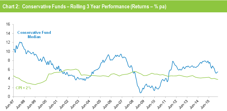 Chart 2 compares the performance of the lower risk Conservative category (21 to 40% growth assets) median with its typical objective of CPI plus 2% per annum over rolling three year periods. It shows that Conservative funds have also exceeded their objective in recent years.