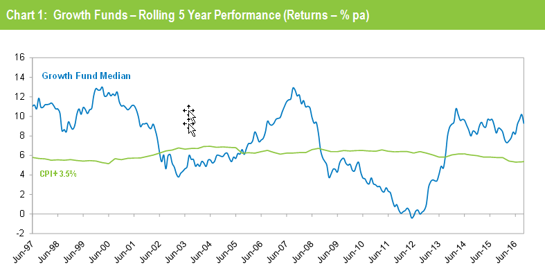 Chart 1 compares the performance since July 1992 – the start of compulsory superannuation – of the Growth category median with the typical return objective for that category (CPI plus 3.5% per annum after investment fees and tax over rolling five year periods). The healthy returns in recent years, combined with the GFC period having worked its way out of the calculation, have seen the five year return continue to track well above that CPI plus 3.5% target.