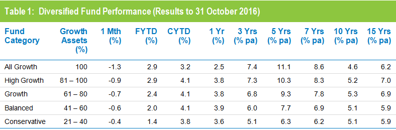 Following a solid September quarter, super funds retreated in October in the lead-up to the US election, with the median growth fund (61 to 80% growth assets) down 0.7% for the month. This brought the return for the first ten months of 2016 to 4.1% so, with only six weeks of the year remaining, there is a good chance that funds will deliver a fifth consecutive calendar year return.